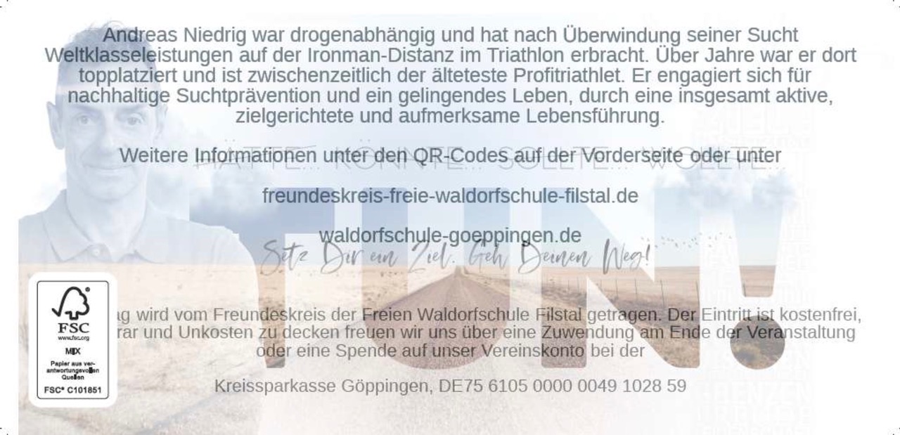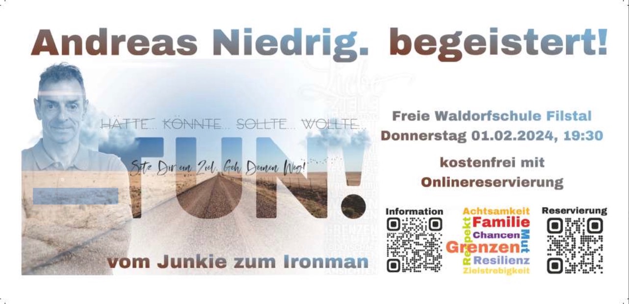 Wir, der Freundeskreis der Waldorfschule Filstal bieten Andreas Niedrig die Bühne, um unseren Schülern und Schüle-rinnen, Widerstandskraft gegen Sucht und positive Impulse für ein zufriedenes, erfüllendes Leben zu vermitteln.