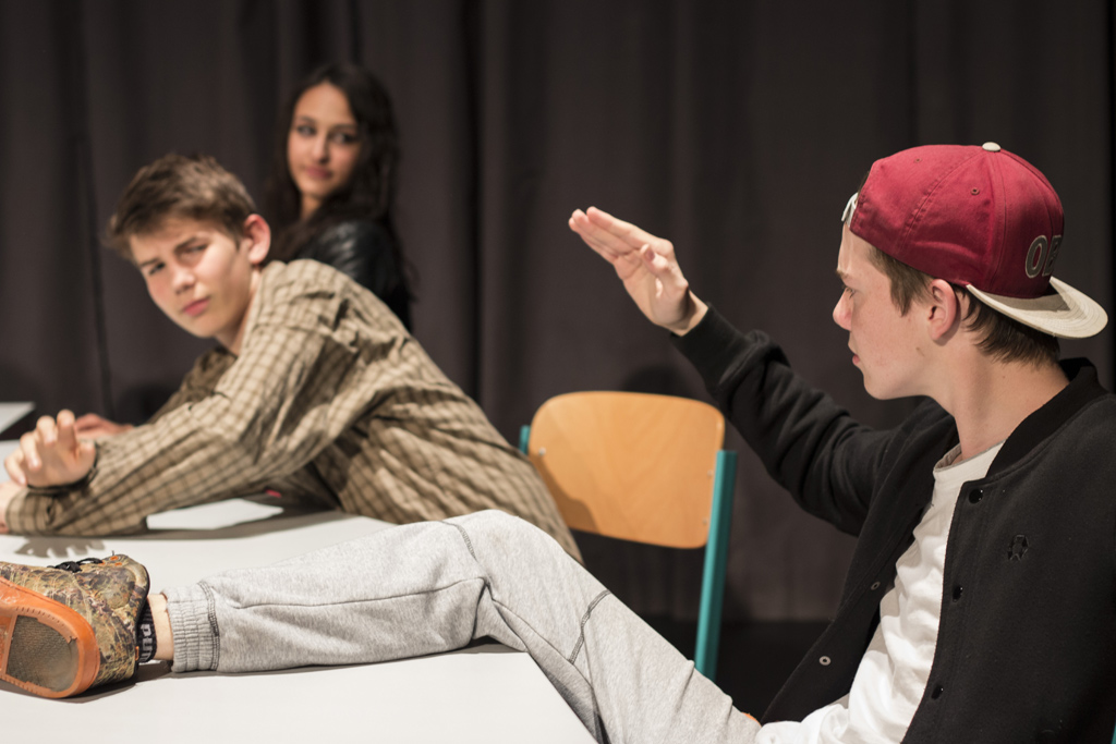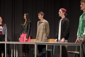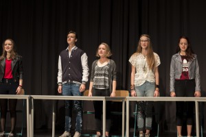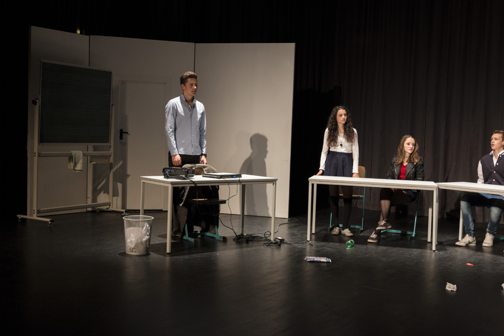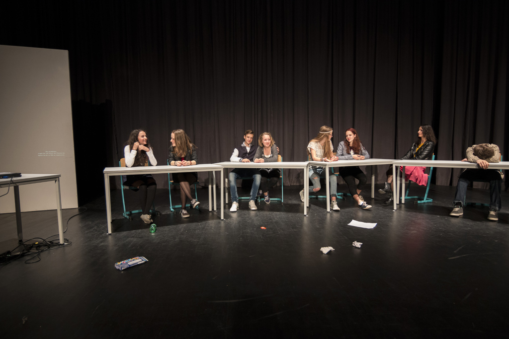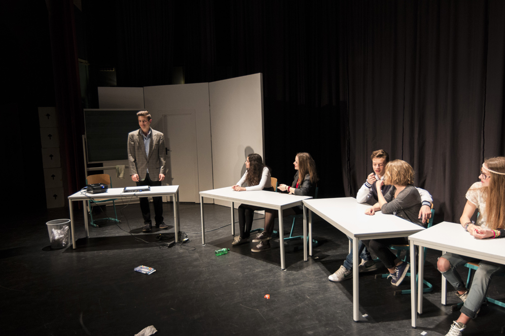 Aufführung der Theater-AG der 9.Klasse: „Das Experiment“ nach dem Roman „Die Welle“ von Morton Rhue. Leitung: Sabine Thoma. 24.4., 25.4. und 26.4.2015