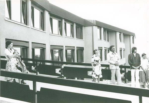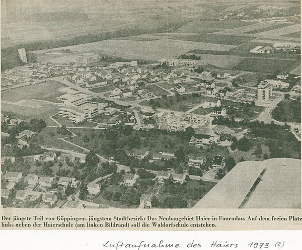 Für sechs Jahre war Auendorf Heimat für die junge Schule. Aber die Zwänge und Provisorien für die Lehrer wuchsen auch mit jedem Jahr. Schon beim Einzug war klar gewesen: Nur ein deutlich größeres Gebäude kann die Zukunft der Schule sichern. Der Landkreis hatte dem Schulverein das Schloss Filseck, damals noch eine Ruine, angeboten. Nach der ersten Euphorie hat man die Gelegenheit jedoch wegen der teuren Denkmalschutz-Auflagen verworfen. In Jebenhausen schien sich eine 2. Möglichkeit aufzutun. Sie scheiterte an den Einsprüchen des Ortschaftsrates. 1974 ergaben sich nach harter politischer Arbeit der Vorstandsmitglieder gleich zwei Möglichkeiten: in Heiningen und in Faurndau. Die bessere Verkehrsanbindung und die günstige Erbpachtregelung gaben nach hartem internen Ringen schließlich den Ausschlag für den „Haier“. Die günstigen Grundstückskosten gaben die Möglichkeit, unser Schulgebäude so schön und großzügig zu bauen, wie es heute ist. Der Einzug zum Schuljahr 1978/79 war ein einziges Fest. Die gerichtlichen Klagen der Nachbarn, denen ihre bisher so schöne Albsicht verbaut wurde, konnte mit mancherlei Zugeständnissen abgewehrt werden. Die zukünftige Entwicklung der Schule im Äußeren war gesichert. Bis zum Abschluss der letzten Neubaumaßnahme sollten aber noch weitere 30 anstrengende Jahre vergehen!